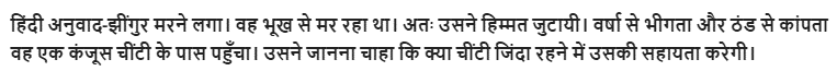 Paraphrase. The cricket came on the verge of death. He was dying of hunger. So he took courage. Wet with rain and shivering with cold, he went to a miserly ant. He wanted to know if the ant would help him keep alive.