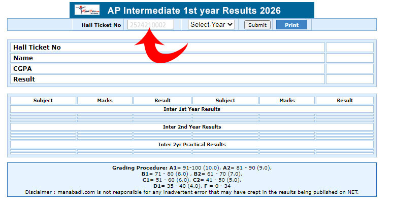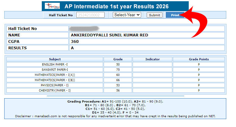 AP Inter 1st Year Results 2026 Manabadi: Grading System
