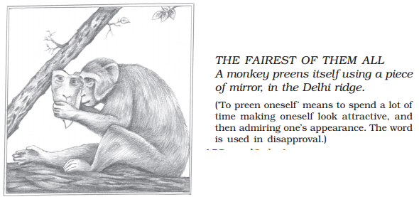 Read the destription given alongside this sketch from a photograph in a newspaper (Times of India, 4 September 1999). Make up a story about what the monkey is thinking, or why it is looking into a mirror. Write a paragraph about it.