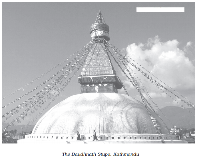 An atmosphere of febrile confusion is seen at Pashupàtinath temple. Priests, devotees, tourists, hawkers, cows, monkeys, pigeons and dogs roam and create chaos. There was a crowd of worshippers. At the Baudhnath Stupa, the Buddhist shrine of Kathmandu, the author noticed everything is calm. Small shops stand on its outer edge. Most of the shops are owned by Tibetan immigrants. There are no crowds and this seemed to be a haven of peace in the busy streets around