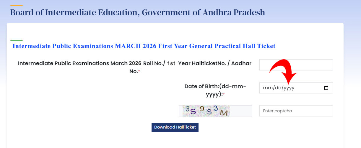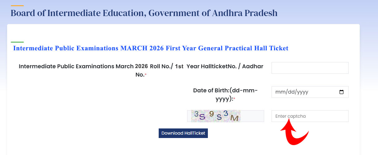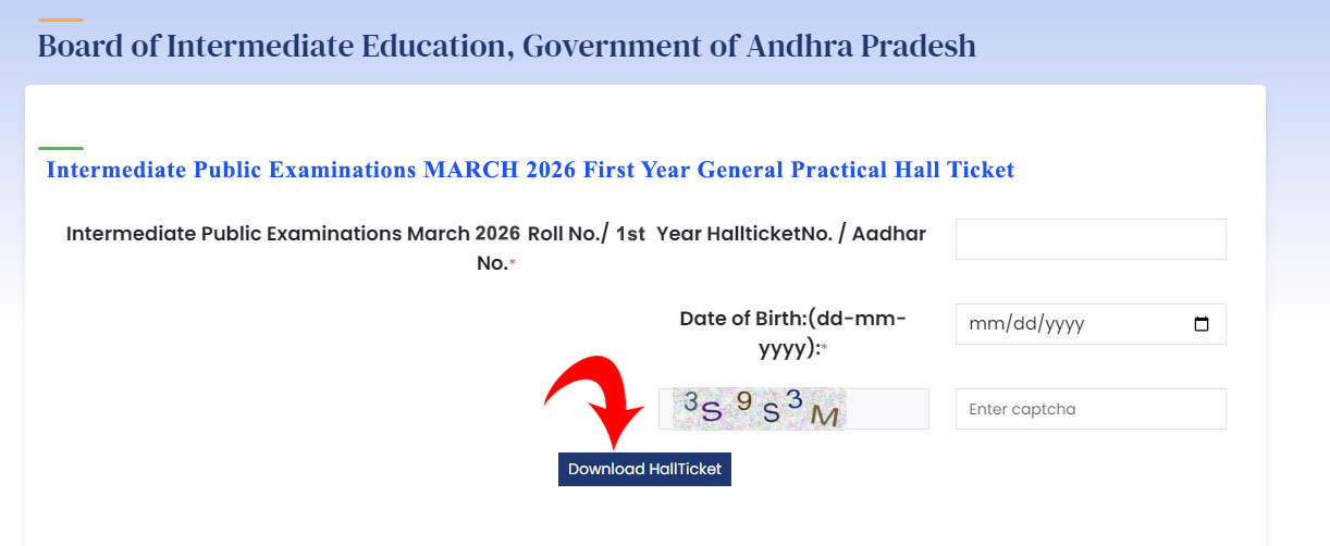 Candidates can download their AP Inter Practical Hall Ticket by entering their First Year Hall Ticket Number or Aadhaar Number, along with their Date of Birth. The hall tickets are available on the official BIEAP website and can also be accessed through the Mana Mitra service by calling 9552300009.