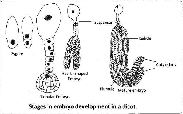 Starting with the zygote, draw the diagrams of the different stages of embryo development in a dicot?