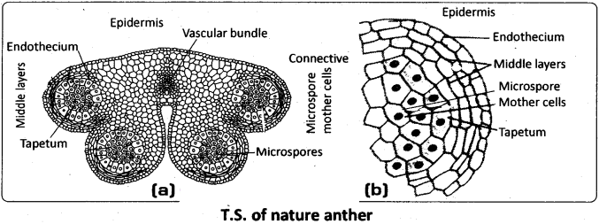 In the remaining 40 per cent of angiosperms, the pollen grains are shed at three celled stage. The reason is the generative cell divides to give rise to two male gametes before pollination.