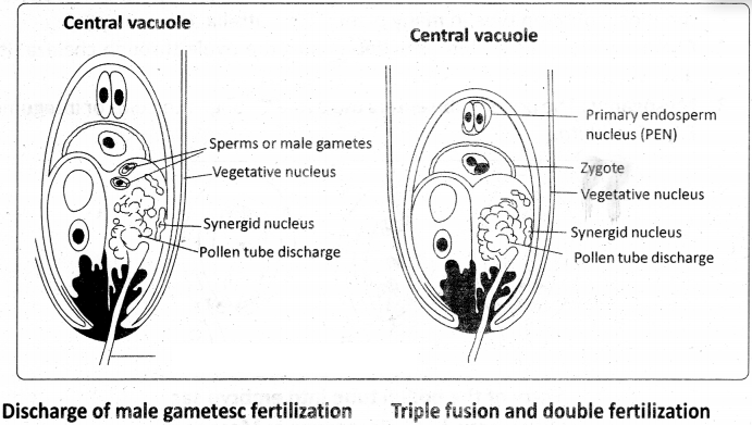 The male gametes are released into the embryo sac by (a) bursting of pollen tube tip or f b) degeneration of the tip or (c) by the formation of an apical pore. The pollen tube finally releases the intact male gametes (cells) and vegetative nucleus.