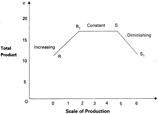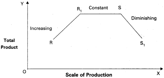 The law of returns to scale relate to long run production function. In the long run it is possible to alter the quantities of all the factors of production. If all factors of production are increased in given proportion the total output has to increase in the same proportion. Ex : The amounts of all the factors are doubled, the total output has to be doubled, increasing all factors in the same proportion is increasing the scale of operation. When all inputs are changed in a given proportion, then the output is changed in the same proportion. We have constant returns to scale and finally arises diminishing returns. Hence, as a result of change in the scale of production, total product increases at increasing rate, then at a constant rate and finally at a diminishing rate.