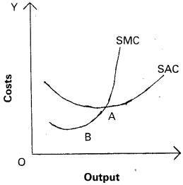 By the figure, output is measured on OX axis and costs on OY axis. It can be seen from this graph that in the beginning as output increases, both AC and MC decrease but the rate of decrease in MC is more than the decrease in AC. At point A, AC = MC and after this point both AC and MC increase but rate of increase in MC is greater than the rate of increase in AC.