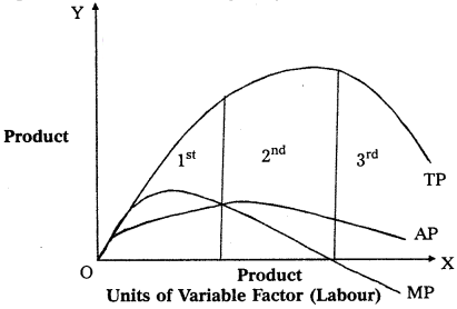 In the diagram, on ‘OX’ axis shown units labourer and ‘OY axis show TP, MP, and A.P. 1st stage TP AP increases and MP is maximum. In the 2nd stage TP is maximum, AP decreases and MP is zero. At 3rd stage TP declines, AP also declines, MP becomes negative.