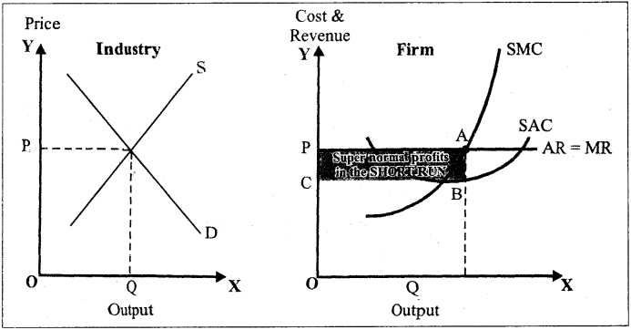 The firm’s SAC curve and SMC curve are also shown respectively. The profits of the firm are maximum at the output where MC = MR, that is, at output OQ, SMC = MR. At any output than OQ, MR exceeds MC, which would mean that if the production is more its profits will increase. At any output more than OQ, MR becomes less than MC, which would mean a loss to the firm. Thus, OQ is output of maximum profits. At the equilibrium point ‘E’, the price is equal to OP or AQ, while AC per unit equals QB, profit per unit is equal to B. Total supernormal profits will be equal to PABC, i.e., BA x OQ.