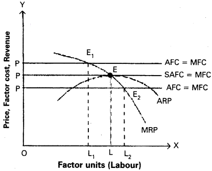 In the figure, OX axis represent units of labour and OY represent price/revenue/cost. At a given price, OP the firm will employ OL units of labour where price OP = L. If it employs less than ‘OL’ i.e., OL1 units, MRP will be E1L1, which is higher than the price OR If firm employs more than OL units upto OL2, price is OP is more than E2L2. So the firm decreases employment until price = MRP till OL. At that point ‘E’ the additional unit of labour is remunerated equal to his marginal productivity.