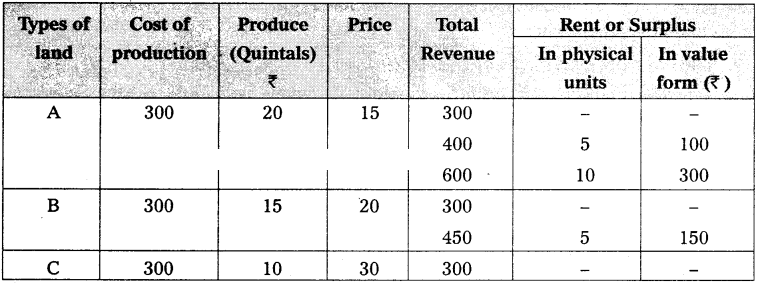 As time passes, population increases and demand for land also increases. In such a case, people have to cultivate next best land, i.e., ‘B’ grade land. The same amount of ₹ 300 is spent on B’ grade land gives only 15 quintals of com as ‘B’ grade land is less fertile. The cost of cultivation on B’ grade land risen to ₹ 20 (300/15) per quintal of com. If the price of corn per quintal in the market is then ₹ 20, the cultivator of ’B‘ grade land will be not cultivate. Therefore, the price has to be high enough to cover the cost of cultivation on ’B’ grade land. Hence, the price also rises to ₹ 20. There is no surplus on ‘B’ grade land. But on A’ grade land, the surplus is 5 quintals or ₹ 100 (5 × 20).