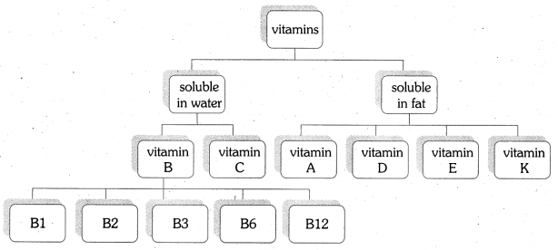 The given tree diagram presents the classification of vitamins. Vitamins are broadly of two types. They are : 1) Soluble vitamins in water and 2) Soluble in fats. Vitamin B and Vitamin C fall in the category of ‘Soluble in water’. Vitamins A, D, E and K (four) belong to the group of vitamins soluble in fat and Vitamin B is sub-divided into Bl, B2, B3, B6 and B12 (five) types.
