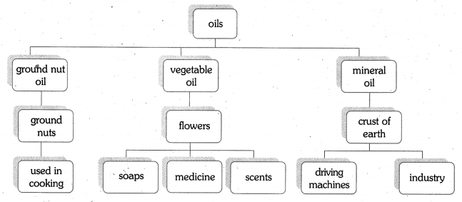 The given tree diagram explains the types of oils. Based on the source, oils are of three categories. They are : 1) Oils from nuts, 2) Oils from vegetation (plants / flowers) and 3) Oils from minerals. Examples are 1) groundnut oil, 2) oils from flowers and 3) oils from the crust of the earth. Groundnut oil is used in cooking. Oils from flowers go into the making of soap, medicines and perfumes (scents). Mineral oil fuels machines and automobiles.