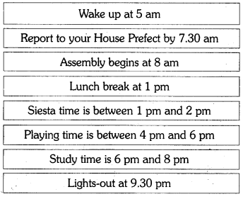 Describe how the following passage is presented in a flow chart. The passage shows the time table for children in a boarding school. You are supposed to wake up at 5 am every day and lights – out time is 9.30 pm. Siesta time is between 1 and 2 in the afternoon. Assembly begins at 8 am sharp in the school hall. You have to report to your House Prefect by 7.30 am on all school days. You may play any game between 4 and 6 pm. You must not be late for study time which is between 6 and 8 in the evening. School timings are from 8.30 am to 3.30 pm with an hour-long lunch break at 1 pm. These details are shown in a flow chart.