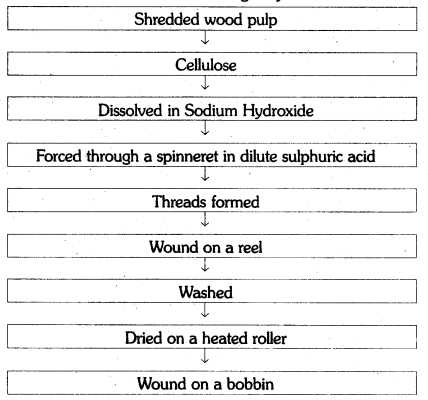 Rayon is a man-made fiber. It is a reconstituted natural fiber – cellulose. Rayon is made by dissolving cellulose in a solution of sodium hydroxide or caustic soda. The cellulose is obtained from shredded wood pulp. The dissolved cellulose is formed into threads by forcing it through a spinneret in a dilute sulphuric acid setting bath. The threads are drawn from the setting bath, wound on a reel, washed, dried on a heated roller, and finally wound onto a bobbin.
