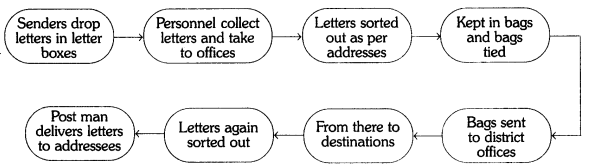 The following process is the description of how a post office transfers a letter from a sender to a receiver. First, the sender posts the letter in a post box. Next, the box is opened. Then the contents in it are sorted out. Then they are kept in a bag and the bag is tied. The destination is written on the bag. The bags are sent to the district post office. The district post office sends the bags to the destination village / town post offices. The destination post office receives the letters. The received letters are arranged and sorted out. The post man delivers the letters to the addressees.