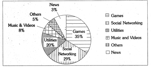 Time spent on smart phones is presented in the given pie chart. The lion’s share, i.e. 35% of the time goes to games. Social networking follows games with its share of 29% of the time. Utilities Consume 20% time. The share of music and videos is 8%. Others take 5% time. News comes last with just 3% time.