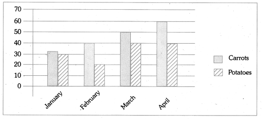 The bar graph given below shows the cost of carrots and potatoes over a period of four months – January, February, March and April. Carrots were more costly than potatoes during all the months. In January carrots cost Rs. 35 a kilo, while potatoes cost a little less, at Rs. 30 a kilo. The cost of carrots increased to Rs. 40 in February, while there was a sharp fall in the cost of potatoes.