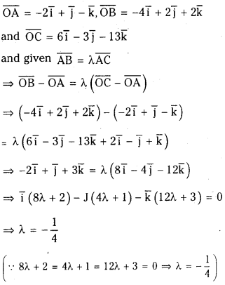 If the position vectors of the points A, B and C are -2i̅ + j̅ – k̅, -4i̅ + 2j̅ + 2k̅ and 6i̅ – 3j̅ – 13k̅ respectively and AB = λAC then find the value of λ. (March 2011) (S.A)