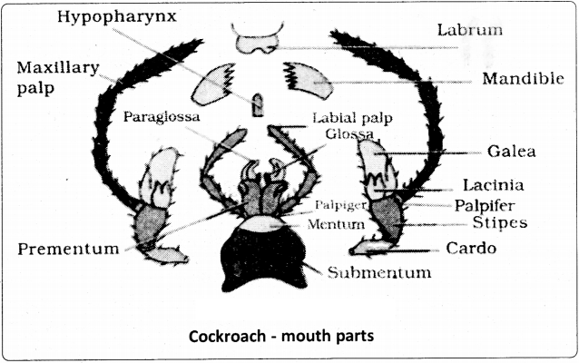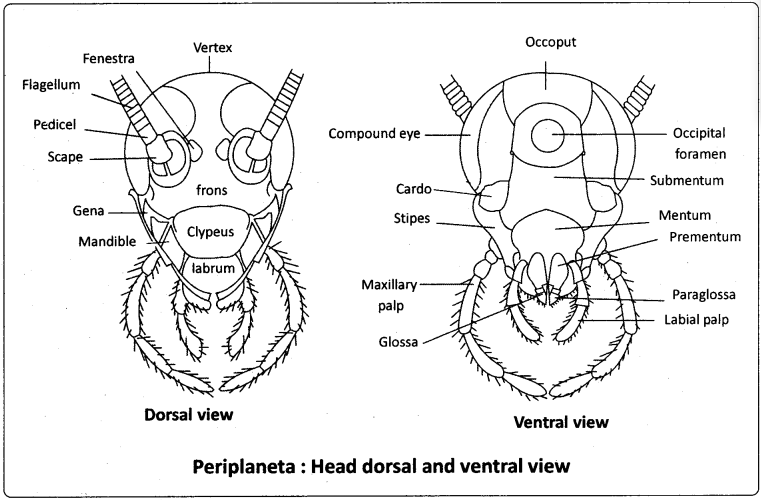 It is bordered by a sclerite called occiput. The occipital foramen forms a passage for the oesophagus, aorta; nerve cord and tracheae. At the base of each antenna, a small whitish speck called fenestra or ‘ocellar spot’ or ‘simple eye’ is present. Appendages are absent in the first and third segments of the head. The second segment bears a pair of long, slenife^ and segmented antennae, one on each side of the head. The antennae are tactile and olfactory in function. The fourth segment bears a pair of mandibles. The fifth segment has a pair of ‘first maxillae’. The sixth segment bears a pair of ‘second maxillae’, which fuse to form the labium (also called ‘lower lip’)