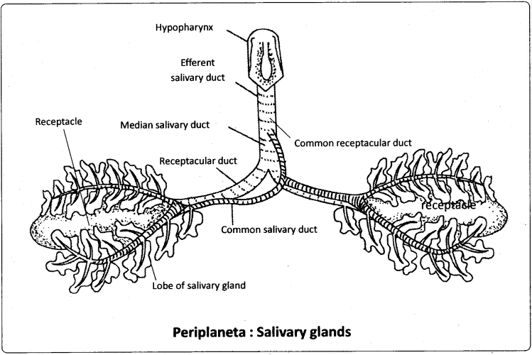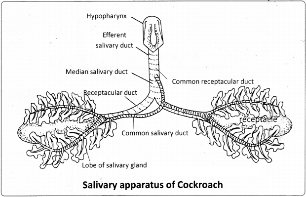 The two common salivary ducts are joined to form the median salivary duct. Between the two lobes of a salivary gland of each side is a sac called salivary receptacle that stores saliva. It leads into a receptacular duct, or ‘reservoir duct’. The receptacular ducts of both the sides are united to form a common receptacular duct, or ‘common reservoir duct’. The median salivary duct opens into the common receptacular duct. Later these two form an efferent salivary duct. The efferent salivary duct opens at the base of the hypopharynx. Acinar cells secrete saliva, which contains starch digesting enzymes such as amylase.