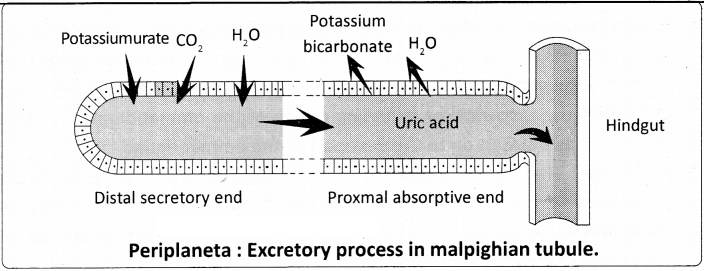 The glandular cells of the malpighian tubules absorb water, salts, CO2 and nitrogenous wastes from the haemohymph and secrete them into the lumen of the tubules. The cells of the proximal part of the tubules reabsorb water and certain inorganic salts. By the contraction of the tubules urine is pushed into the ileum. More water is reabsorbed from it, when it moves in to the rectum and almost solid uric acid is excreted along with faecal matter.