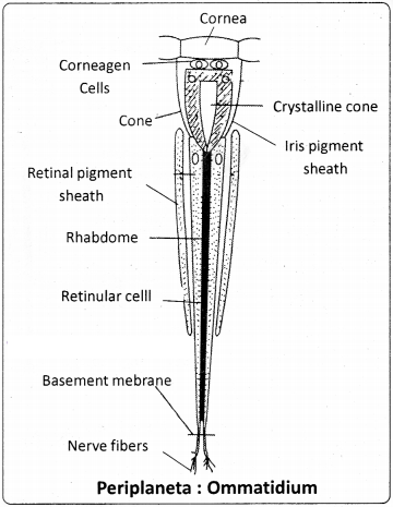 These are the innermost and elongated cell of an ommatidium. They are seven in number. They rest on the basement membrane. Each cell bears microvilli towards the inner surface. Microvilli of each retinular cell collectively form a rhabdomere that contains photoreceptor pigments. These rhabdomeres fuse along the axis of the ommatidium to form the rhabdome in the centre. Retinulae are the nerve cells from which sensory nerve fibres leave as the optic nerve to the protocerebrum. They are the photoreceptor cells of the ommatidium. Rhabdome and retinulae form the retinal or receptor region. Receptor region is surrounded by seven secondary pigment cells, which absorb light and serve to isolate each ommatidium from the rest (retinal pigment sheath).