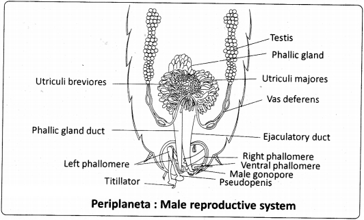 The seminal vesicles are present on the ventral surface cf the ejaculatory duct. These sacs store the sperms in the form of bundles called spermatophores. The ejaculatory duct is a muscular tube that extends posteriorly and opens at the gonopore or the ‘male genital pore’. The duct of phallic or conglobate gland also opens near the gonopore. Its function is still not known. Surrounding the male genital opening there are chitinous and asymmetrical structures called phallic organs or gonapophyses or phallomeres which help in copulation. These are the male external genitalia.