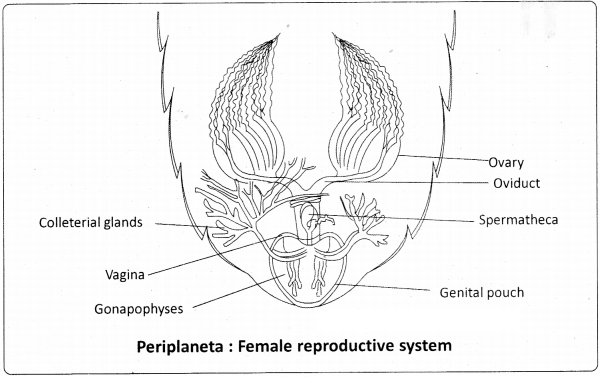 A pair of branched colleterial glands is present behind the ovaries. These glands open into the genital pouch separately, just above the spermathecal aperture. Secretion of the two collaterial glands forms a hard egg case called ootheca around the eggs.