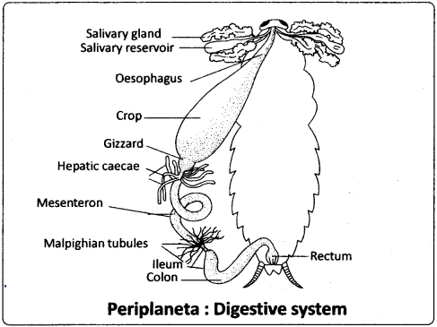 The foregut includes pharynx, oesophagus, crop, and gizzard. It is internally lined by a chitinous cuticle. Mouth opens into the pharynx, which in turn leads into a narrow tubular oesophagus. The oesophagus opens behind into a thin walled distensible sac called crop. The crop serves as a reservoir for storing food. Its outer surface is covered by a network of tracheae.