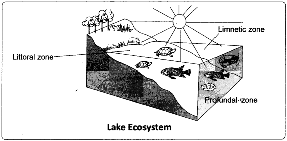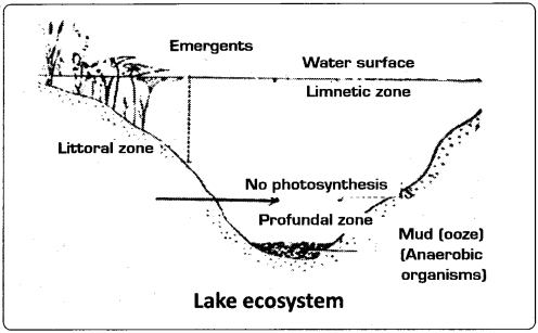 Lakes are large inland water bodies containing standing/still water (Recall: Lentic community). They are deeper than ponds (pond is not an ideal example as it is very shallow). Most lakes contain water throughout the year. In deep lakes, light cannot penetrate more than 200 meters, in depth. They are vertically stratified in relation to light intensity, temperature, pressure, etc., Deep water lakes contain three distinct zones namely, i) littoral zone, ii) limnetic zone, and iii) profundal zone. Hence lake ecosystem is described as a micro model for the entire biosphere.