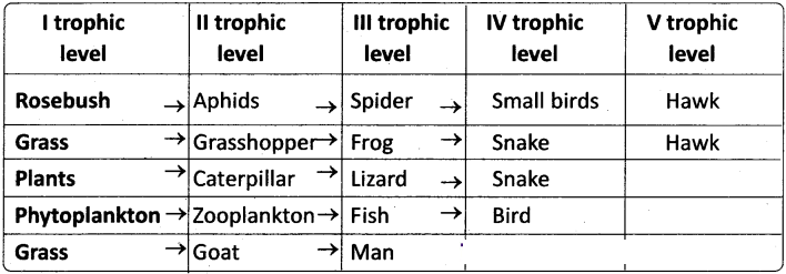 It is also known as predatory food chain. It begins with the green plants (producers) and the second, third and fourth trophic levels are occupied by the herbivores, primary carnivores and secondary carnivores respectively. In some food chains there is yet another trophic level – the climax carnivores. The number of trophic levels in food chains varies from 3 to 5 generally. Some examples for grazing food chain (GFC) are given below.