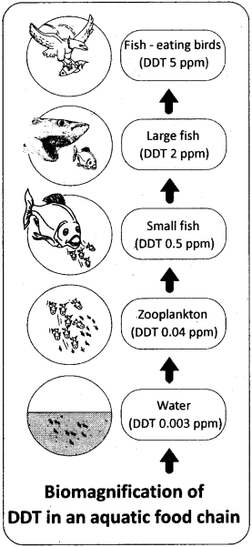 As shown in the above example, the concentration of DDT is increased at successive trophic levels starting at a very low concentration of 0.003 ppb (ppb – parts per billion) in water, which ultimately reached an alarmingly high concentration of 25 ppm (ppm – parts per million) in fish-eating birds, through bio-magnification. High concentrations of DDT disturb calcium metabolism in birds, which causes thinning of egg shell and their premature breaking, eventually causing decline in bird populations.
