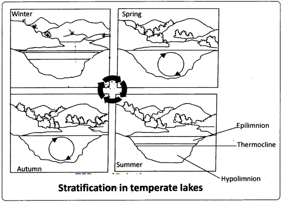 In the ‘Spring season’ the temperatures start rising. When it reaches 4°C, the water becomes more dense and heavy and sinks to the bottom, taking ‘oxygen rich water’ to the bottom. The upper oxygen rich water sinks down and the bottom ‘nutrient rich water’ reaches the surface. It is called ‘spring overturn’. The lakes which show overturns twice a year are called ‘dfmictic lakes’. Thus ‘stratifications’ and ‘overturns’ help survival of organisms at all levels in deep lakes.