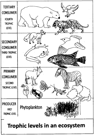 Energy flows into biological systems (ecosystems) from the Sun. The biological systems of environment include several food levels called trophic levels. A trophic level is composed of those organisms which have the same source of energy and having the same number of steps away from the sun. Thus a plant’s trophic level is one, while that of a herbivore – two, and that of the first level carnivore – three. The second and third levels of the carnivores occupy fourth and fifth trophic levels respectively.
