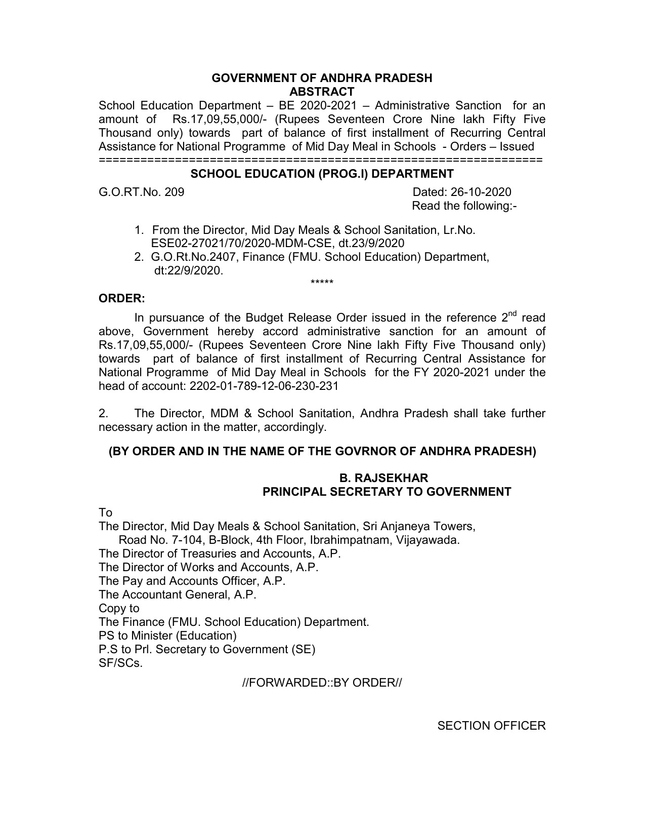 1.In pursuance of the Budget Release Order issued in the reference 2nd read above, Government hereby accord administrative sanction for an amount of Rs.17,09,55,000/- (Rupees Seventeen Crore Nine lakh Fifty Five Thousand only) towards part of balance of first installment of Recurring Central Assistance for National Programme of Mid Day Meal in Schools for the FY 2020-2021 under the head of account: 2202-01-789-12-06-230-231