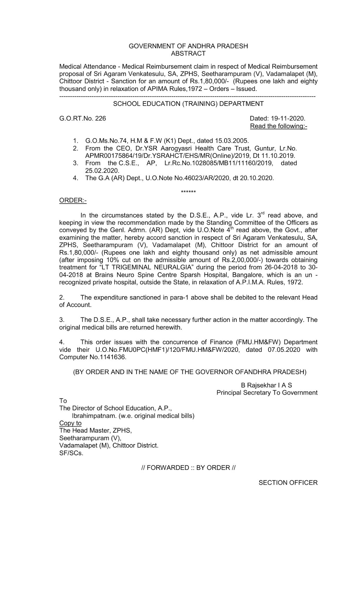 1.In the circumstances stated by the D.S.E., A.P., vide Lr. 3rd read above, and keeping in view the recommendation made by the Standing Committee of the Officers as conveyed by the Genl. Admn. (AR) Dept, vide U.O.Note 4th read above, the Govt., after examining the matter, hereby accord sanction in respect of Sri Agaram Venkatesulu, SA, ZPHS, Seetharampuram (V), Vadamalapet (M), Chittoor District for an amount of Rs.1,80,000/- (Rupees one lakh and eighty thousand only) as net admissible amount (after imposing 10% cut on the admissible amount of Rs.2,00,000/-) towards obtaining treatment for "LT TRIGEMINAL NEURALGIA" during the period from 26-04-2018 to 30- 04-2018 at Brains Neuro Spine Centre Sparsh Hospital, Bangalore, which is an un - recognized private hospital, outside the State, in relaxation of A.P.I.M.A. Rules, 1972.
