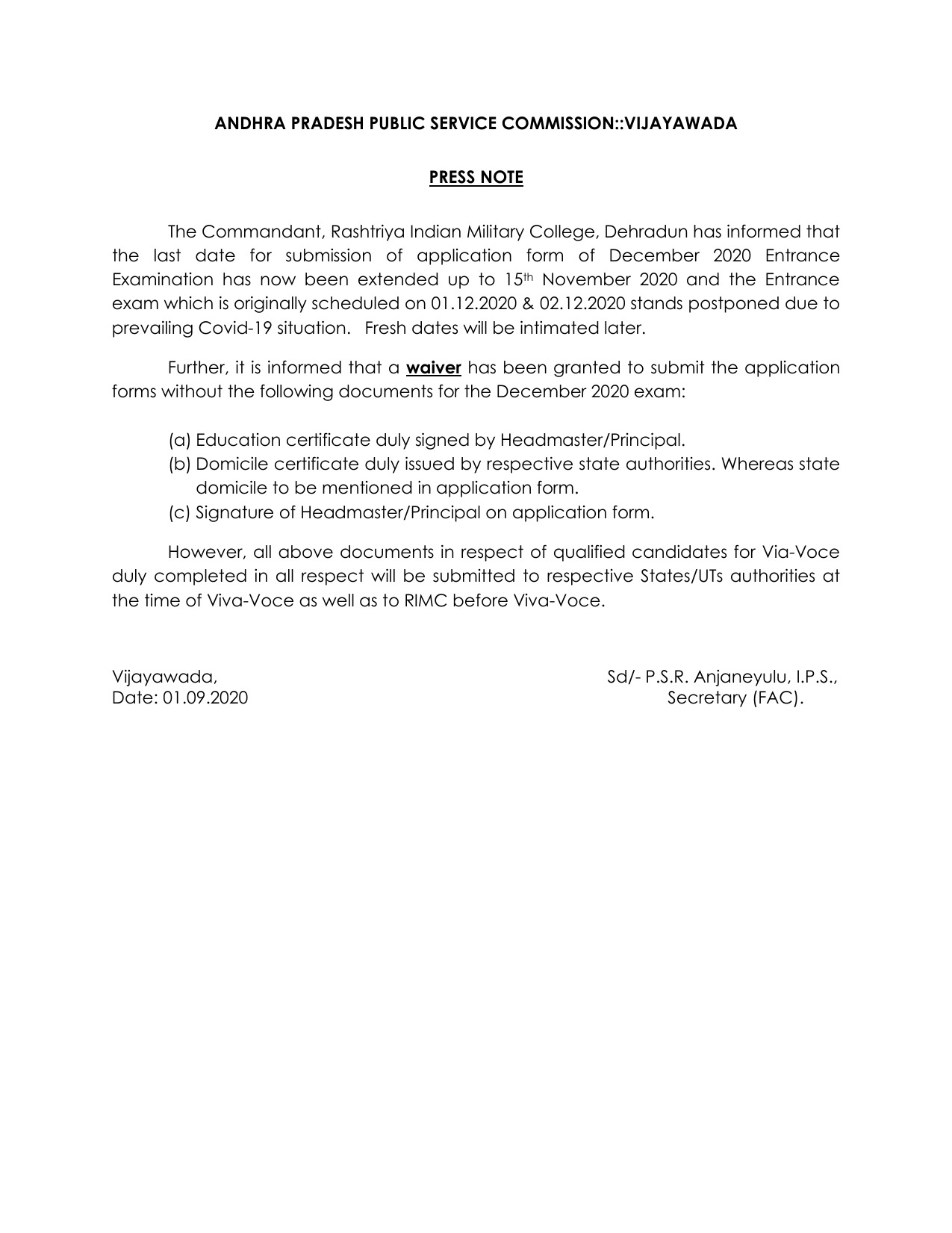 The Commandant, Rashtriya Indian Military College, Dehradun has informed that the last date for submission of application form of December 2020 Entrance Examination has now been extended up to 15th November 2020 and the Entrance exam which is originally scheduled on 01.12.2020 & 02.12.2020 stands postponed due to prevailing Covid-19 situation. Fresh dates will be intimated later.