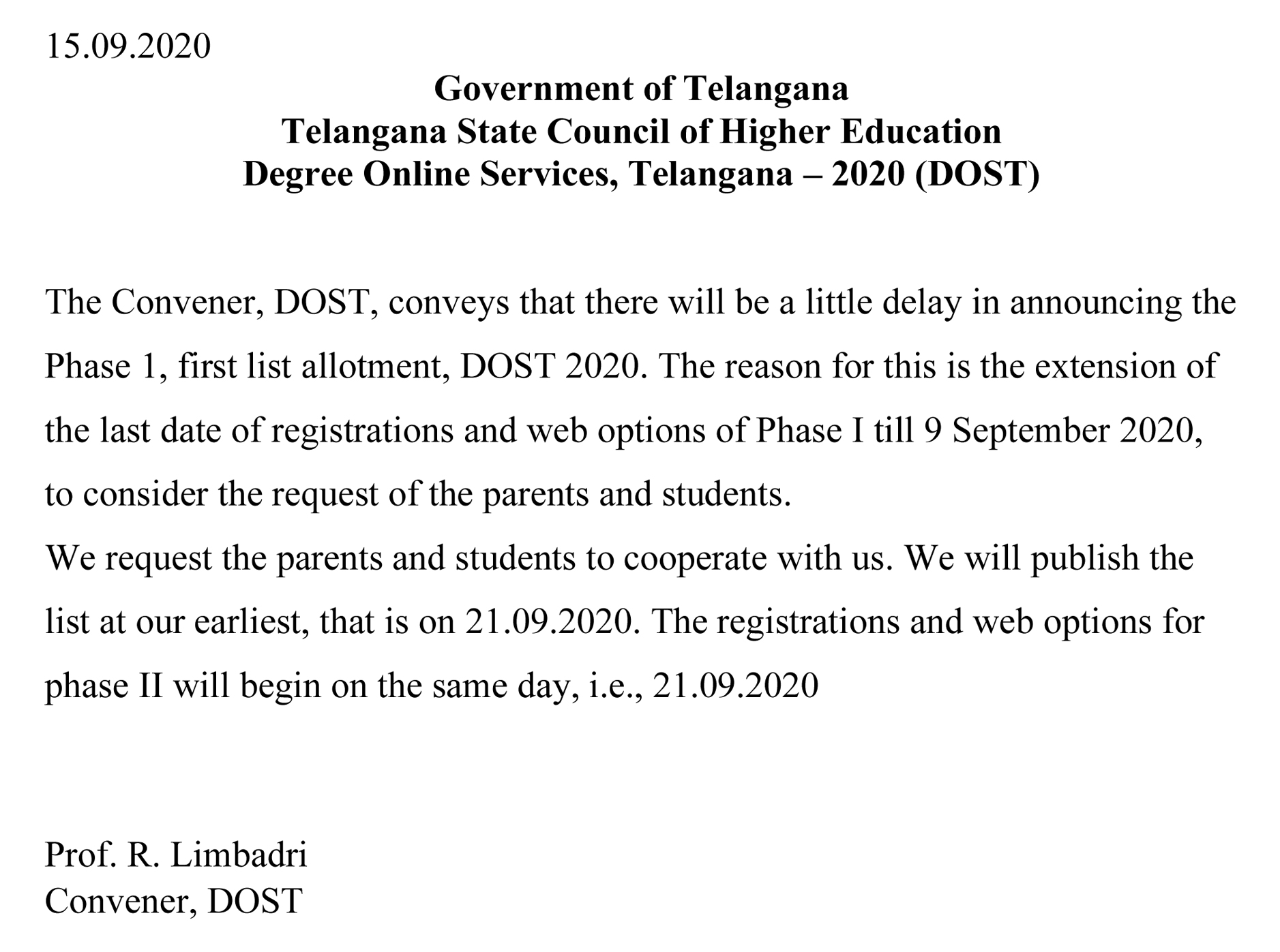 The Convener, DOST, conveys that there will be a little delay in announcing the Phase 1, first list allotment, DOST 2020. The reason for this is the extension of the last date of registrations and web options of Phase I till 9 September 2020, to consider the request of the parents and students. We request the parents and students to cooperate with us. We will publish the list at our earliest, that is on 21.09.2020. The registrations and web options for phase II will begin on the same day, i.e., 21.09.2020