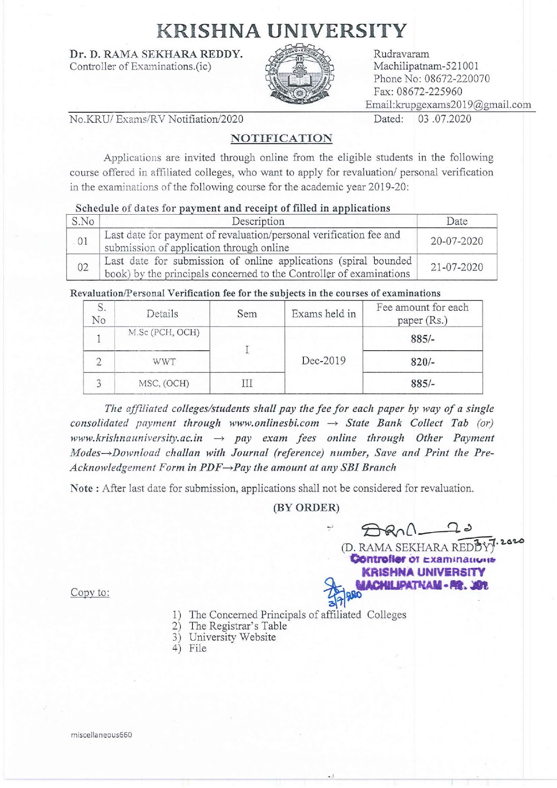 krishna university pg 1st & 3rd sem phase-iv dec 2019 revaluation fee notification