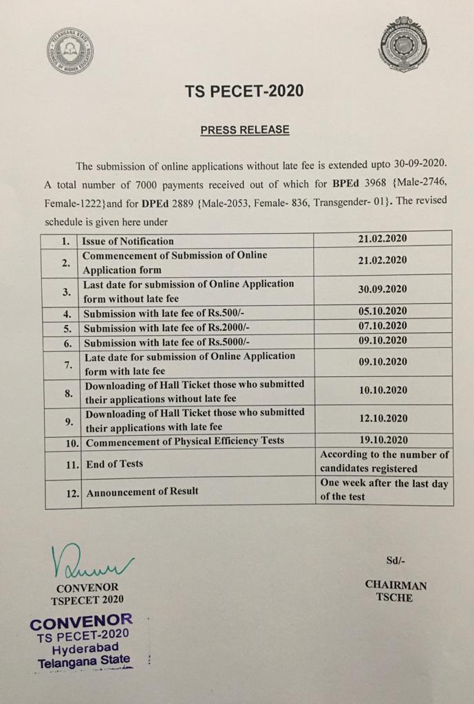 The submission of online applications without late fee is extended upto 30-09-2020. A total number of 7000 payments received out of which for BPEd 3968 (Male-2746, Female-1222)and for DPEd 2889 (Male-2053, Female- 836, Transgender- 01). The revised schedu c is given here under
