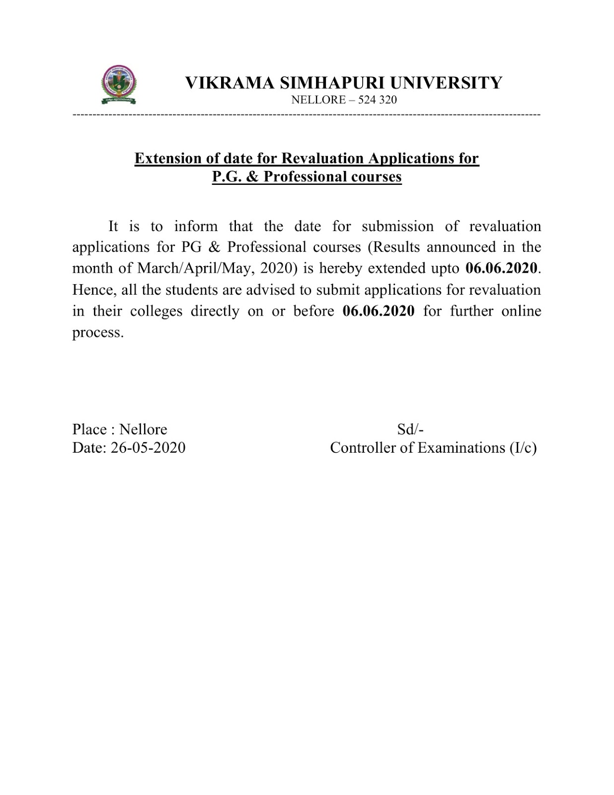 It is to inform that the date for submission of revaluation applications for PG & Professional courses (Results announced in the month of March/April/May, 2020) is hereby extended upto 06.06.2020. Hence, all the students are advised to submit applications for revaluation in their colleges directly on or before 06.06.2020 for further online process.