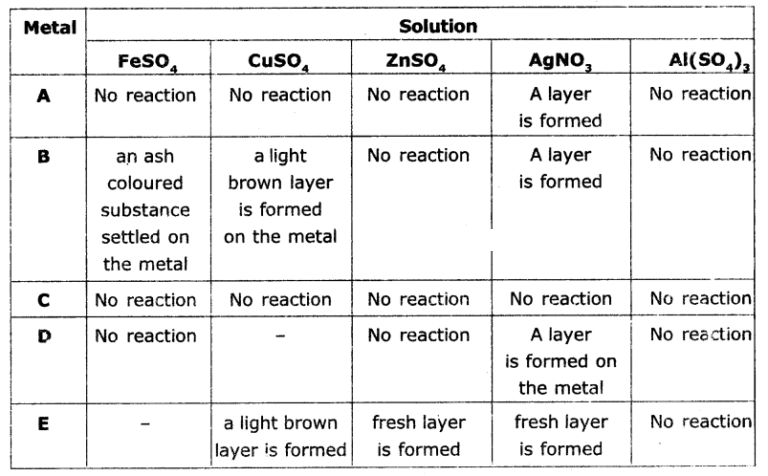 The results of reactions of metals A, B, C, D, and E with different solutions are given In the table below. Observe the table and write answers.