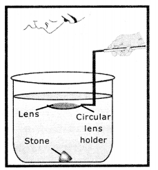 We can see the ¡mage of the stone ¡f the distance between stone is less than the focal length of the Iens(in air). Now increase the distance between lens and stone until you cannot see the Image of the stone.