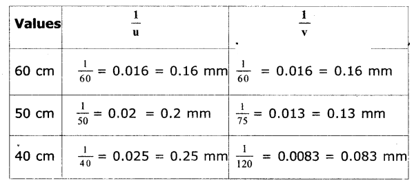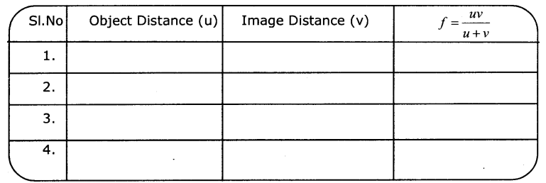 - Measure the distance of image (v) from lens and record the value’s of u and v in the table.