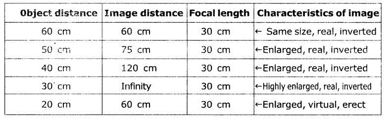 - Repeat the experiment for various object distances like 50 cm, 40cm, 30cm etc. Measure the image distances in all cases and note them in table.