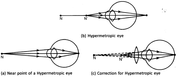 A person with hypermetropia can see distant objects clearly but cannot see objects at near distances. This is also known as ‘far sightedness This can be corrected by using a convex lens of suitable focal length.