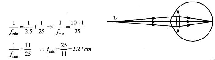1. To find the focal length of lens let us consider that the object is at the point of least distance of distinct vision (L)