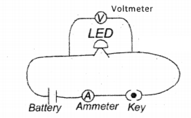 Materials required: 5 dry cells of 1.5V each, conducting wires, an ammeter, a voltmeter, thin iron spoke of length 10 cm, LED, and key.