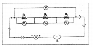 - Similarly connect the voltmeter across the resistors, one at a time and measure the voltage across them as V1, V2,and V3.