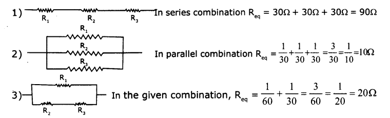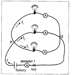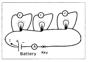 - Connect three bulbs which act as resistors in series, with a battery, ammeter and a plug key.